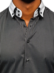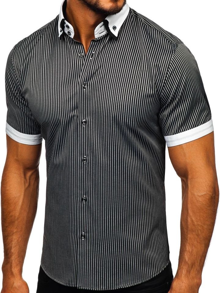 La chemise noire extrêmement confortable, ajoustée à la silhouette slim fit Bolf. Elle est idéale pour des stylisations informelles, fiable au printemps et en été. La chemise noire avec la manche courte a les rayures délicates et le col blanc. Il a l'air bien avec un jean, des baskets, un blazer lâche.