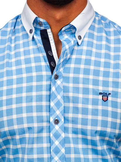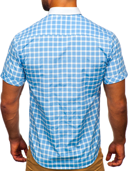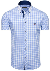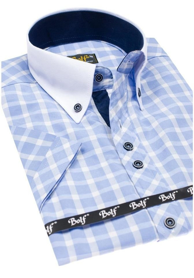 La chemise bleue claire à carreaux pour homme Bolf avec le col blanc, contrasté. Légère, ajustée à la silhouette, extrêmement confortable. La chemise bleue claire avec les manches courtes slim fit est le must have. Elle est essentiel pour une stylisation sympa avec un short, un pantalon chino et un slip-on ou des mocassins.
