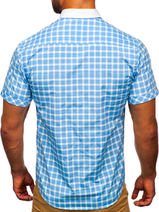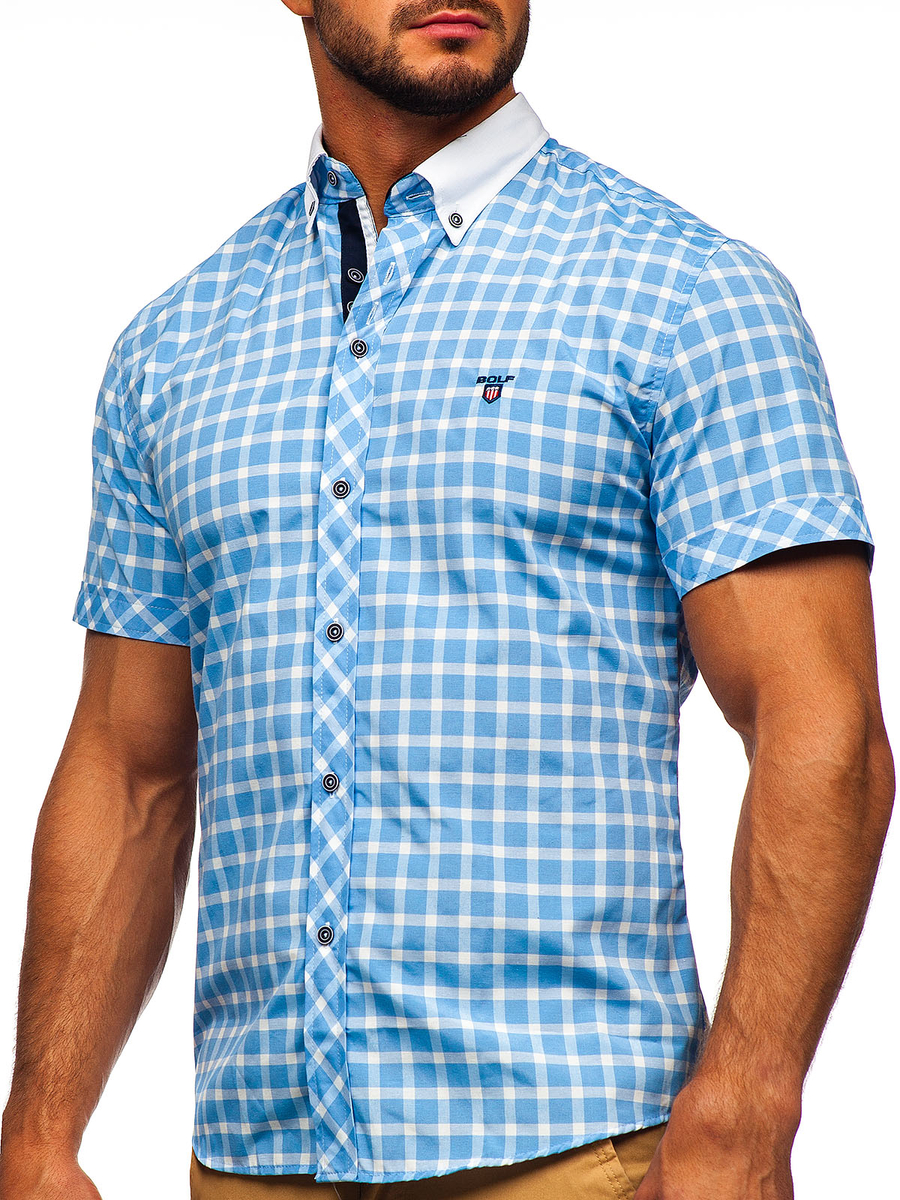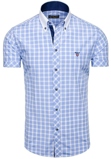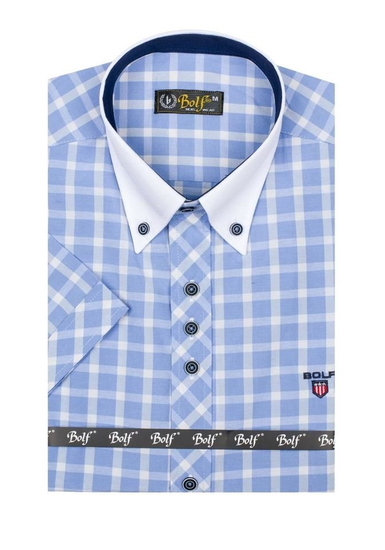 Opinions des utilisateurs de La chemise élégante à carreaux avec les manches courtes pour homme bleue claire Bolf 5531
