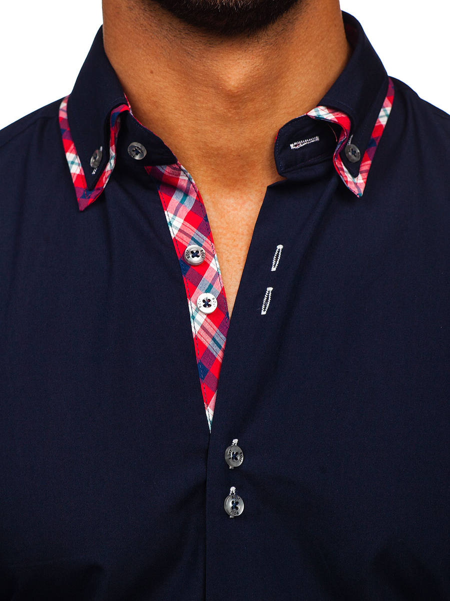La chemise bleue foncée avec les manches longues Bolf va parfaitement dans une stylisation quotidienne. Il a l'air pas mal sous une veste. Il va bien dans des tenues moins formelles. La chemise bleue foncée pour homme slim fit est ajusté, très confortable. Les inserts à carreaux attirent immédiatement l'attention.