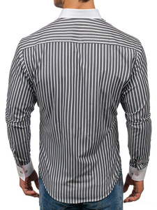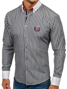 La chemise unique graphite avec la manche longue Bolf en rayures verticales, avec le col blanc et les manches. Il s'adapte immédiatement à la silhouette, il a le col boutonné à la mode. La chemise business graphite se présente génialement avec un pantalon chino et un jean. Portez-le aussi sous une veste.