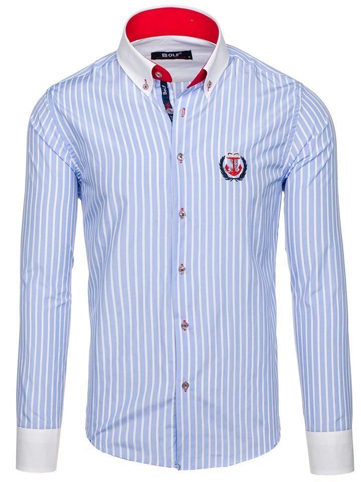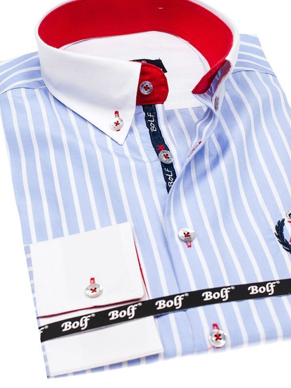 La chemise unique bleue claire avec la manche longue Bolf en rayures verticales, avec le col blanc et les manches. Il s'adapte immédiatement à la silhouette, il a le col boutonné à la mode. La chemise business bleue claire se présente génialement avec un pantalon chino et un jean. Portez-le aussi sous une veste.