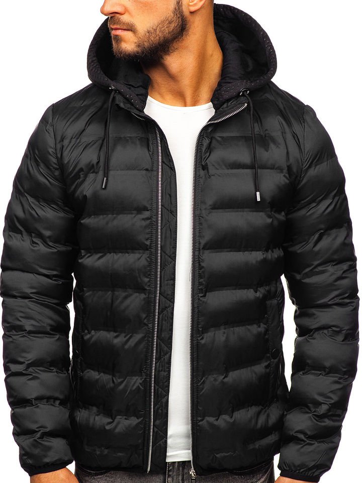 La veste d'hiver pour homme Bolf 5332 en noir est extrêmement légère. Avec une fermeture à glissière confortable, il fonctionne bien dans les sports et les styles de tous les jours. Il a une capuche en tissu amovible, vous pouvez donc décider si vous en avez besoin ou non. Après avoir détaché la capuche, nous obtenons une veste avec un col montant. Deux poches extérieures à boutons-pression Les bouts des manches sont élastiques