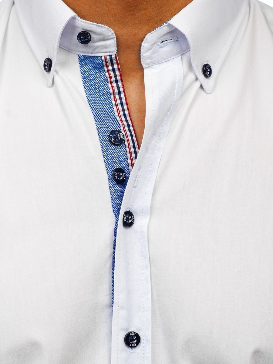 La chemise classique pour homme slim fit Bolf en couleur blanche, avec un col boutonné. Confortable, à la mode et soigneusement cousu. La chemise blanche avec les manches longues slim fit va bien souligner une silhouette, sera un complément parfait des stylisations décontractées. Il va bien avec un jean et un pantalon chino.