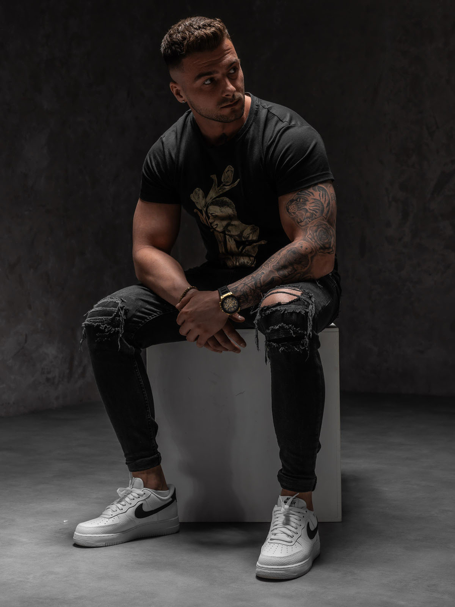 Le t-shirt noir pour homme avec un imprimé Bolf Y70052 est un excellent choix pour les hommes qui apprécient le style original. Le T-shirt a un imprimé inhabituel sur le devant. Le produit a également une encolure ronde. Il est destiné aux fans de style de tous les jours. Parfait pour les voyages en ville, les rencontres entre amis et les promenades. Le T-shirt est composé de 65% coton et 35% polyester, grâce auxquels il est extensible et adhère parfaitement au corps. Il aura fière allure en combinaison avec un jean et un jogger.