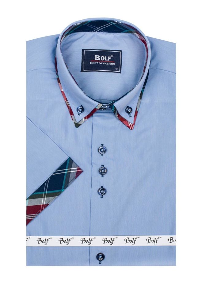 Aimez-vous enfreindre les règles? Avez-vous votre propre style? En été choisissez une chemise bleue claire avec les manches courtes slim fit Bolf. Elle est beaucoup moins formelle qu'un modèle avec les manches longues et plus élégante qu'un t-shirt ou un polo. La chemise bleue claire pour homme est jolie, slim. Les détails à carreaux lui donnent du chic.