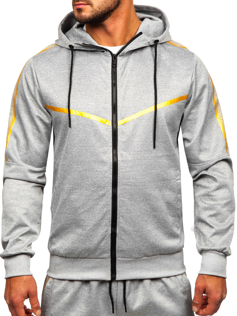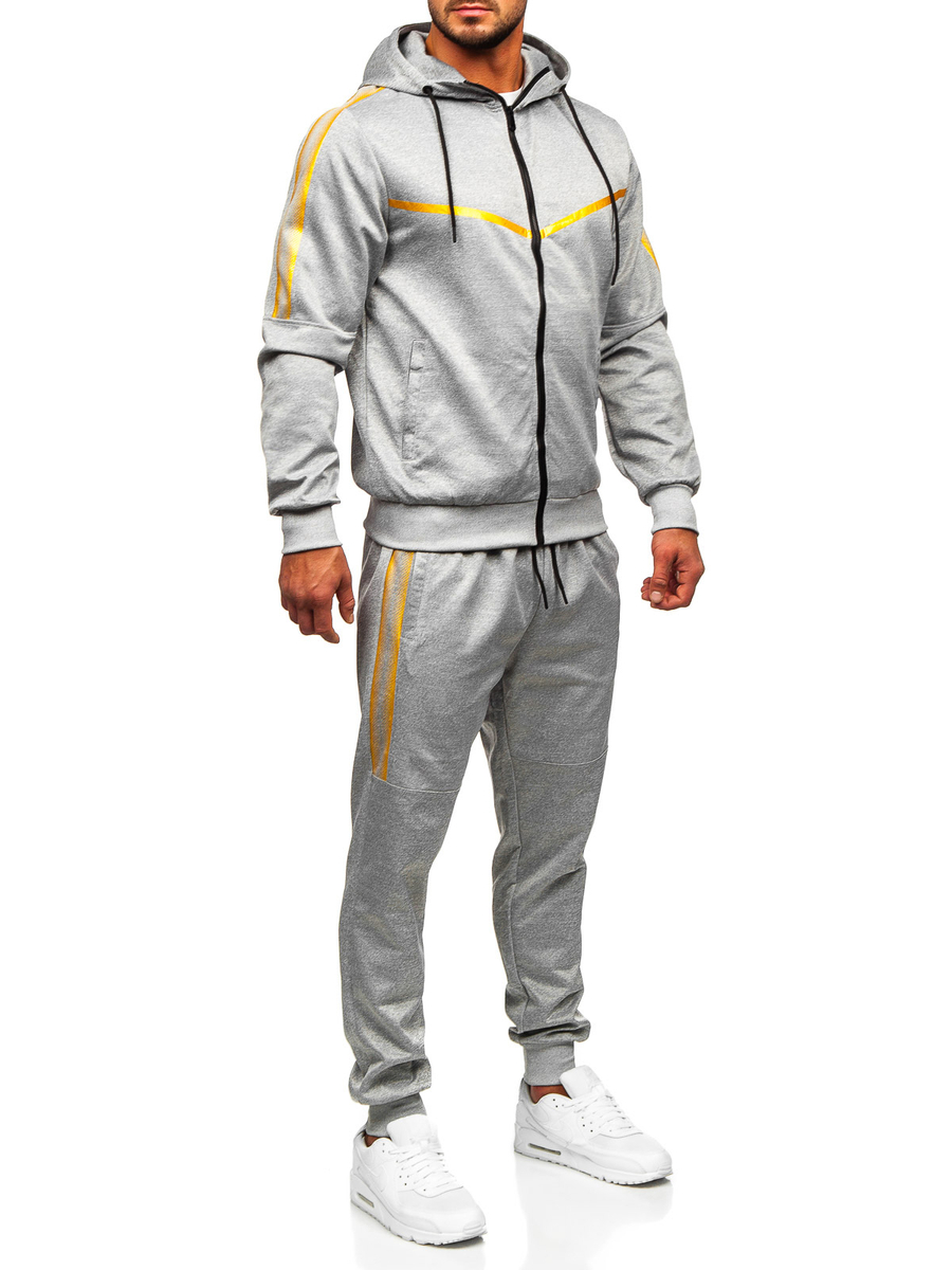 Le survêtement à capuche pour homme gris Bolf 27C8117 est parfait pour tous ceux qui aiment le confort et le sport! Le complet contient un sweat-shirt et un pantalon de sport. Le sweat-shirt a une capuche réglable, un col montant et deux poches extérieures. Le pantalon a une taille ajustable avec une trépointe forte et un cordon et deux poches sur les côtés. Une coupe simple et ajustée lui donne un look de sport. Un imprimé tendance, que l'on retrouve aussi bien sur le sweat que sur le pantalon, vous donnera du caractère et vous démarquera à la salle de sport! Le produit est fabriqué dans un tissu doux, agréable au toucher. Le sweat et le pantalon peuvent être combinés avec des autres éléments de la garde-robe pour obtenir plusieures possibilités de la création des stylisations quotidiennes. Le complet va bien fonctionner avec un tee-shirt et un gilet.