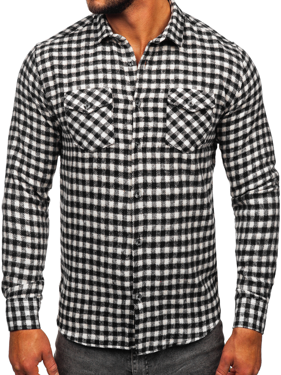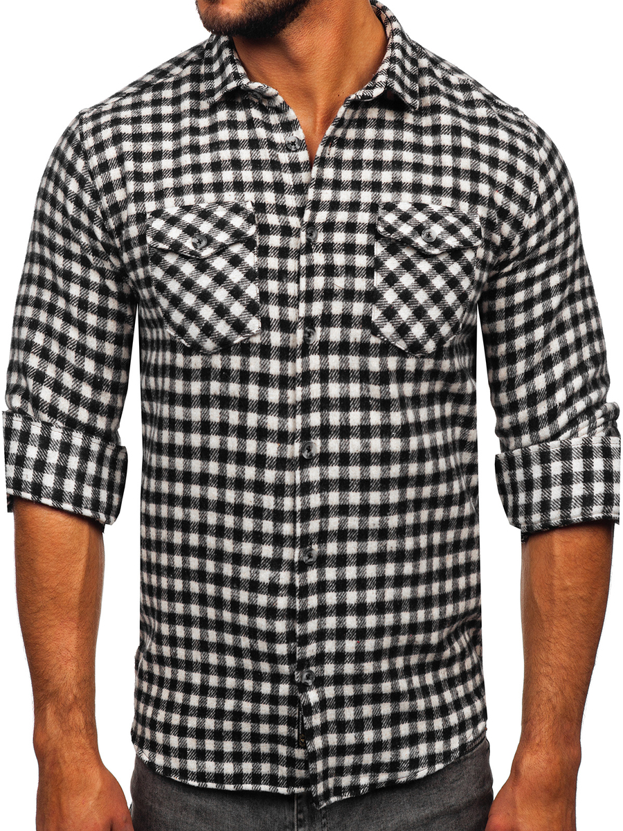 Chemise en flanelle à carreaux à manche longue pour homme noire-blanche Bolf 22701