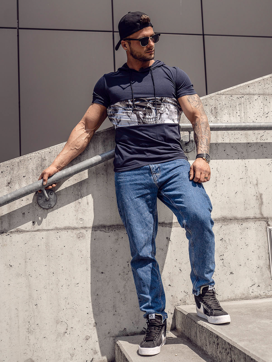 Le tee-shirt pour homme bleu foncé Bolf 8T971A est une proposition parfaite pour les hommes qui aiment des motifs remarquables et distinctifs. Le tee-shirt va bien fonctionner dans des stylisations quotidiennes et urbaines. Sa couleur universelle permet de le combiner facilement avec d'autres vêtements, et un imprimé sur le devant apporte un caractère de rock. Portez-le avec un jean slim fit et un blouson de motard, afin de créer une stylisation pour une soirée avec des amis ou un concert. Le coupe slim fit souligne parfaitement la silhouette et les épaules. Le tee-shirt a une capuche réglable et intégrée qui offre une protection contre le vent et a une fonction décorative. L'association du coton et du polyester assure une bonne élasticité et une douceur de la matière et rend le tee-shirt extrêmement agréable à porter. Il est disponible en: bleu foncé, blanc et noir.