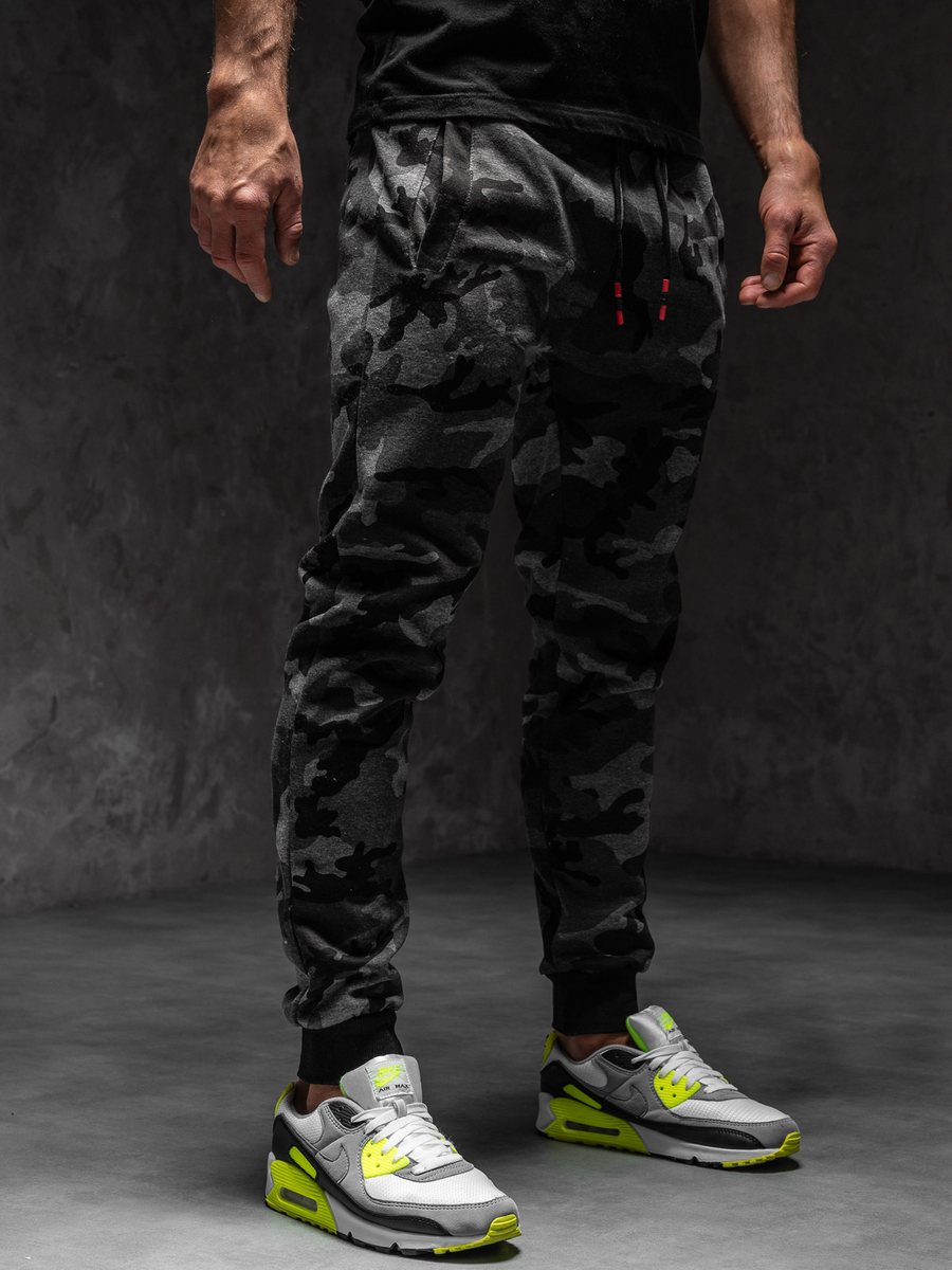 Le pantalon de sport graphite pour homme Bolf à motif camo à la mode. Il a deux poches, une trépointe forte à la taille, est reglée avec un cordon. Portez le pantalon de sport graphite camo dans des tenues de sport et streetwear avec un t-shirt et un sweat-shirt oversize. Idéal au quotidien