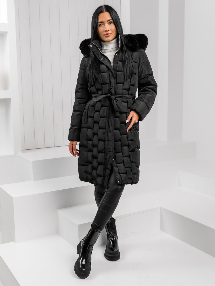 Femme Blouson d'hiver longue matelassée à capuche Noir Bolf 11Z8179
