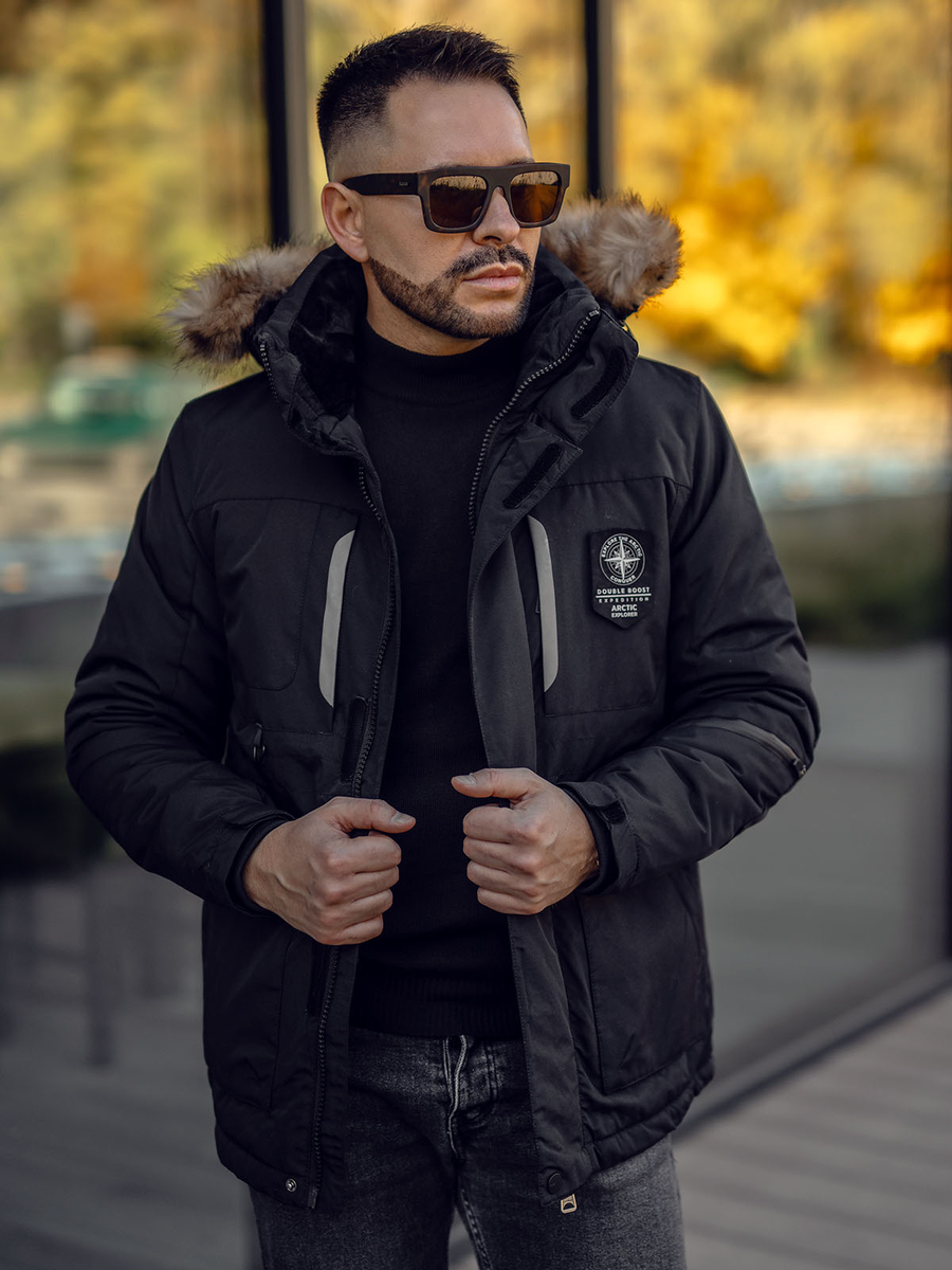 Le blouson d'hiver chaud et pratique noir Bolf. Il a six grandes poches, une capuche amovible et une fourrure. Il va génialement fonctionner dans des jours froids, a des trépointes aux manches, un fermoir double et il est réglable avec un cordon à l'interieur. Le blouson noir pour homme va bien avec un pull épais, un jean et des chaussures d'un style trappeur.