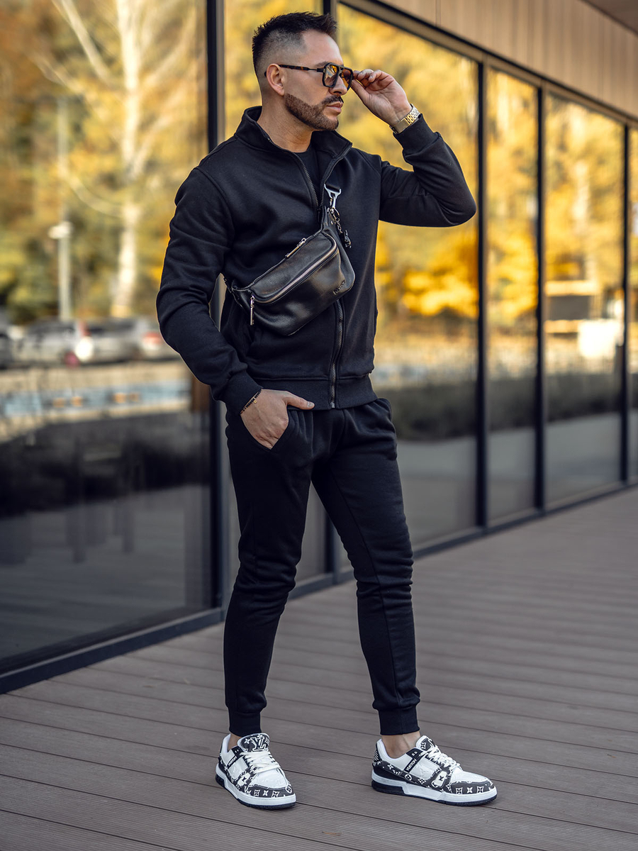 Le survêtement pour homme noir Bolf 10385A2 est un set de sport qui est composé d'un sweat-shirt et d'un pantalon sportif. Le sweat-shirt est fermé par une fermeture éclair et possède des poches extérieures. Le pantalon a une taille ajustable avec une trépointe forte et un cordon et deux poches extérieures. Une coupe simple et ajustée lui donne un look de sport. Le produit est fabriqué dans un tissu doux, agréable au toucher. Le complet de survêtement peut être une base universelle pour créer des tenues de tous les jours ou de sport. Le sweat et le pantalon peuvent être combinés avec des autres éléments de la garde-robe pour obtenir plusieures possibilités de la création des stylisations quotidiennes. Le complet va bien fonctionner avec un T-shirt et un blouson de transition léger ou de sport.